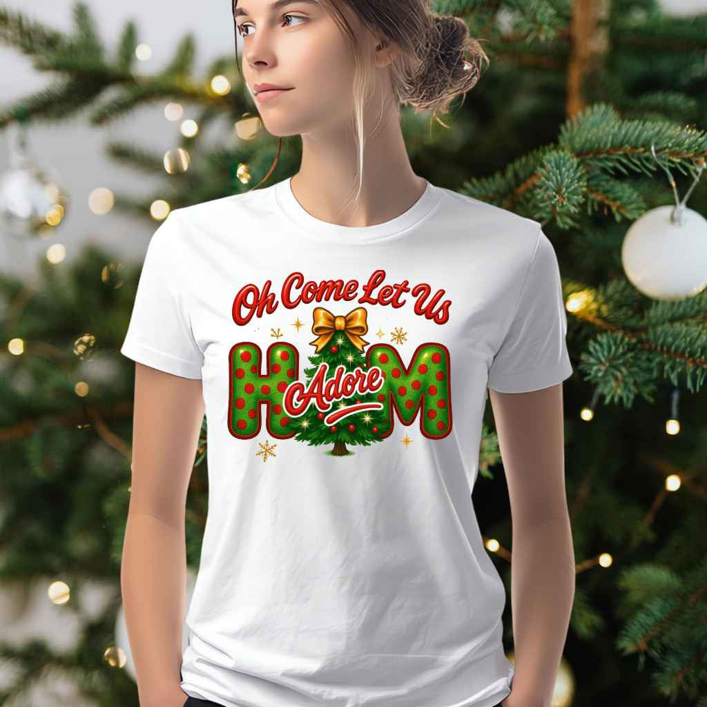 This “Oh Come Let Us Adore Him” design celebrates the true meaning of the season—Jesus. The word Him is done up in fun, polka-dot Christmas letters with a Christmas tree, topped with a golden bow for that classic holiday feel.
